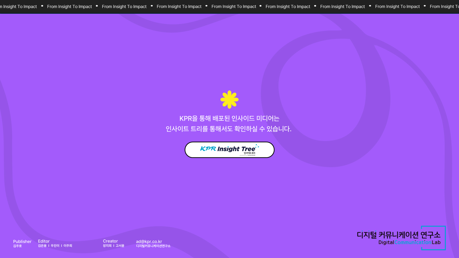 KPR 인사이트 트리는 기업, 정부, 기관 등의 마케팅 실무자는 물론, 경영 관리·책임자들에게 꼭 필요한 마케팅 인사이트를 제공하기 위해 커뮤니케이션 전략 컨설팅 그룹 KPR과 빅데이터 미닝 사이언스 랩 TAPACROSS가 공동으로 발행하는 빅데이터 의미 분석 기반 트렌드 리포트 서비스 입니다.