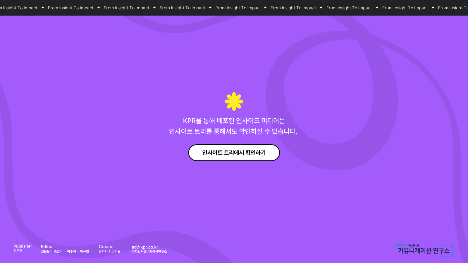 KPR 인사이트 트리는 기업, 정부, 기관 등의 마케팅 실무자는 물론, 경영 관리·책임자들에게 꼭 필요한 마케팅 인사이트를 제공하기 위해 커뮤니케이션 전략 컨설팅 그룹 KPR과 빅데이터 미닝 사이언스 랩 TAPACROSS가 공동으로 발행하는 빅데이터 의미 분석 기반 트렌드 리포트 서비스 입니다.