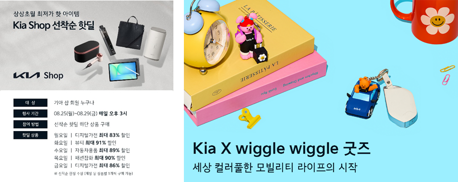기아는 라이프스타일 브랜드 위글위글과 협업한 한정판 제품을 공개했다. 주차번호판과 폴딩 카트, 룸미러장식 등 차량에서 사용할 수 있는 제품을 순차적으로 선보였다. 룸미러 장식은 액운을 막고 행운을 가져다준다는 의미를 가진 액막이 명태를 귀여운 위글 베어가 들고 있는 형태로 눈길을 끌었다. 한편, 기아는 기아샵 회원에게만 최대 91% 할인된 가격으로 한정 판매하는 선착순 이벤트를 진행하거나, 기간 한정 제품을 무료로 배송하는 등 커뮤니티 회원을 대상으로 한 혜택을 강화하고 있다.