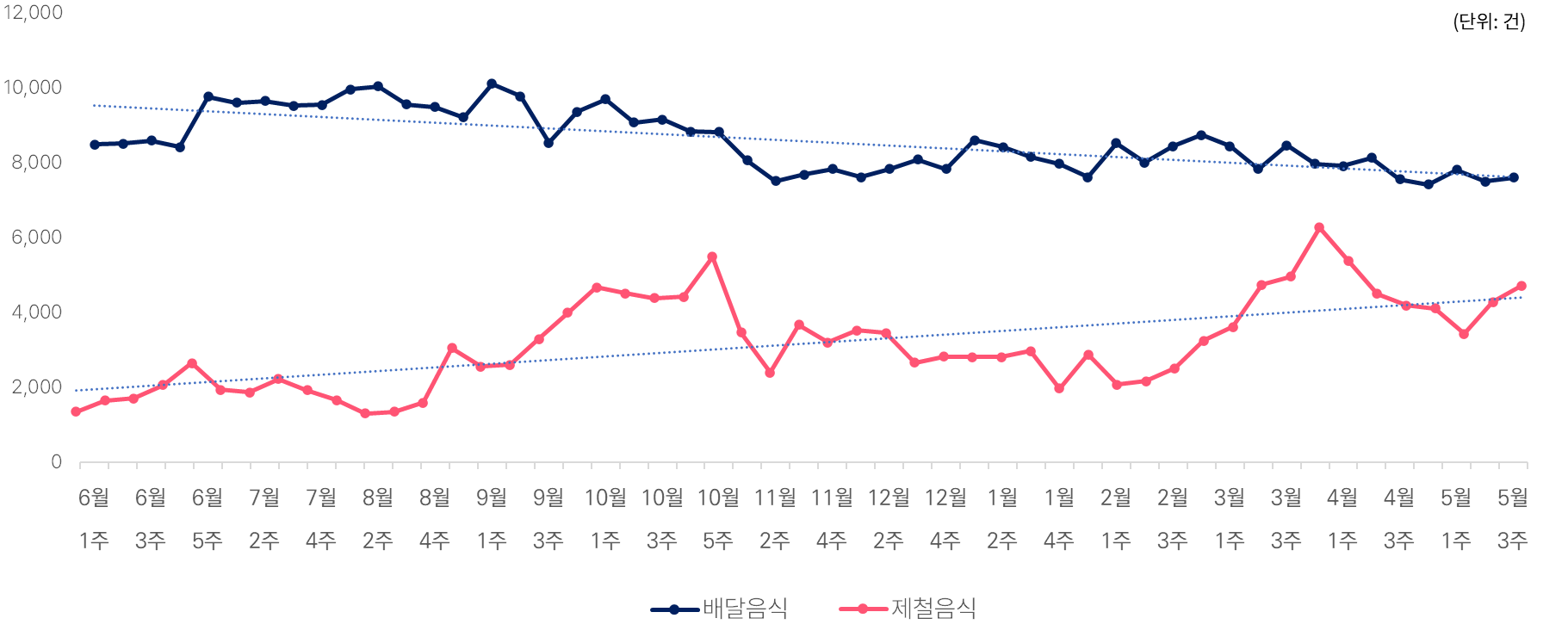 [배달음식 · 제철음식 언급량 증감률 추이]